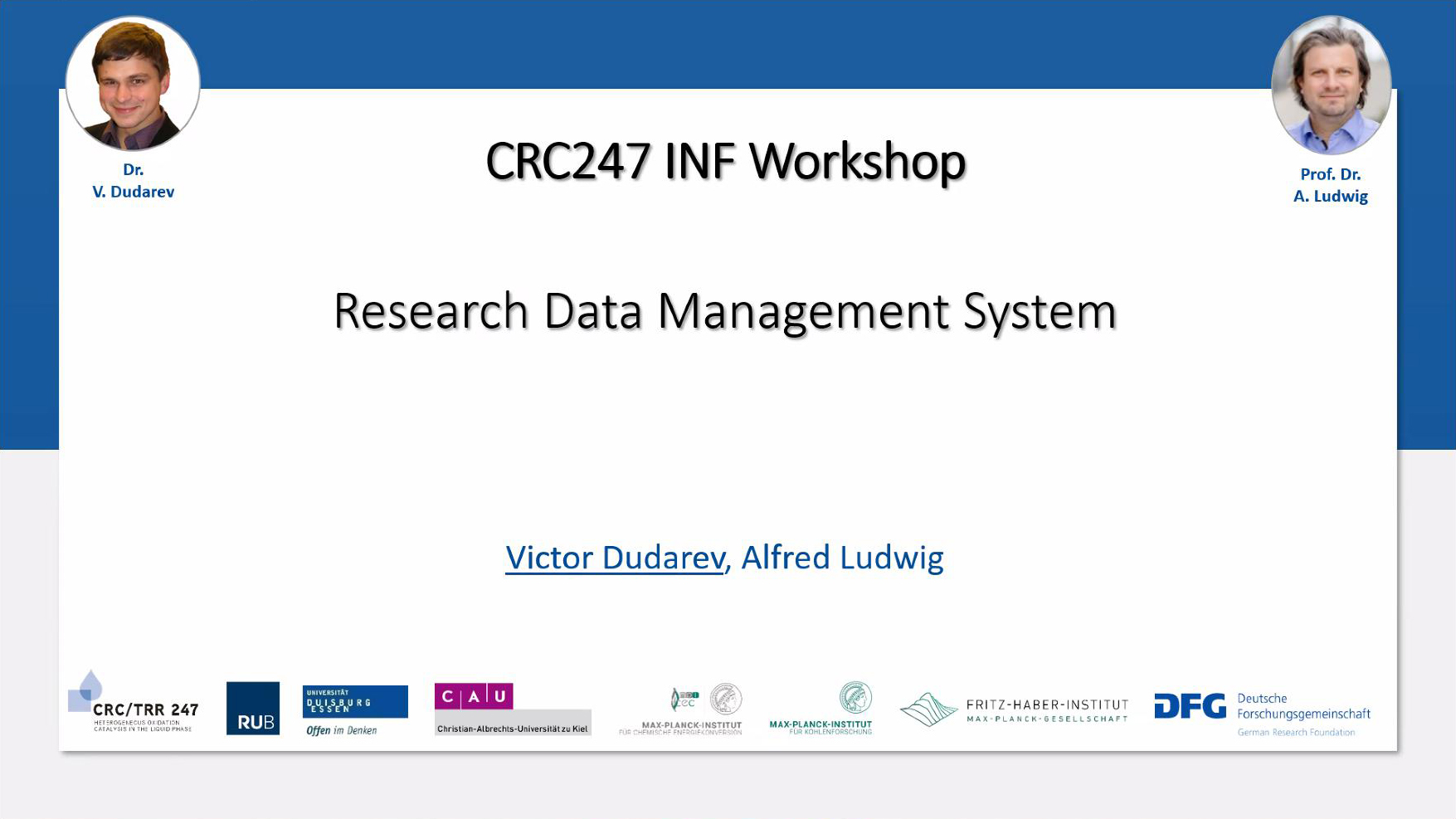 [18 March 2025] Dr. Victor Dudarev and Prof. Alfred Ludwig presented the CRC/TRR 247 Research Data Management System (RDMS) at a recent workshop. The session covered RDMS features for seamless data storage, efficient search and analysis, and user-friendly sharing among CRC/TRR 247 groups.