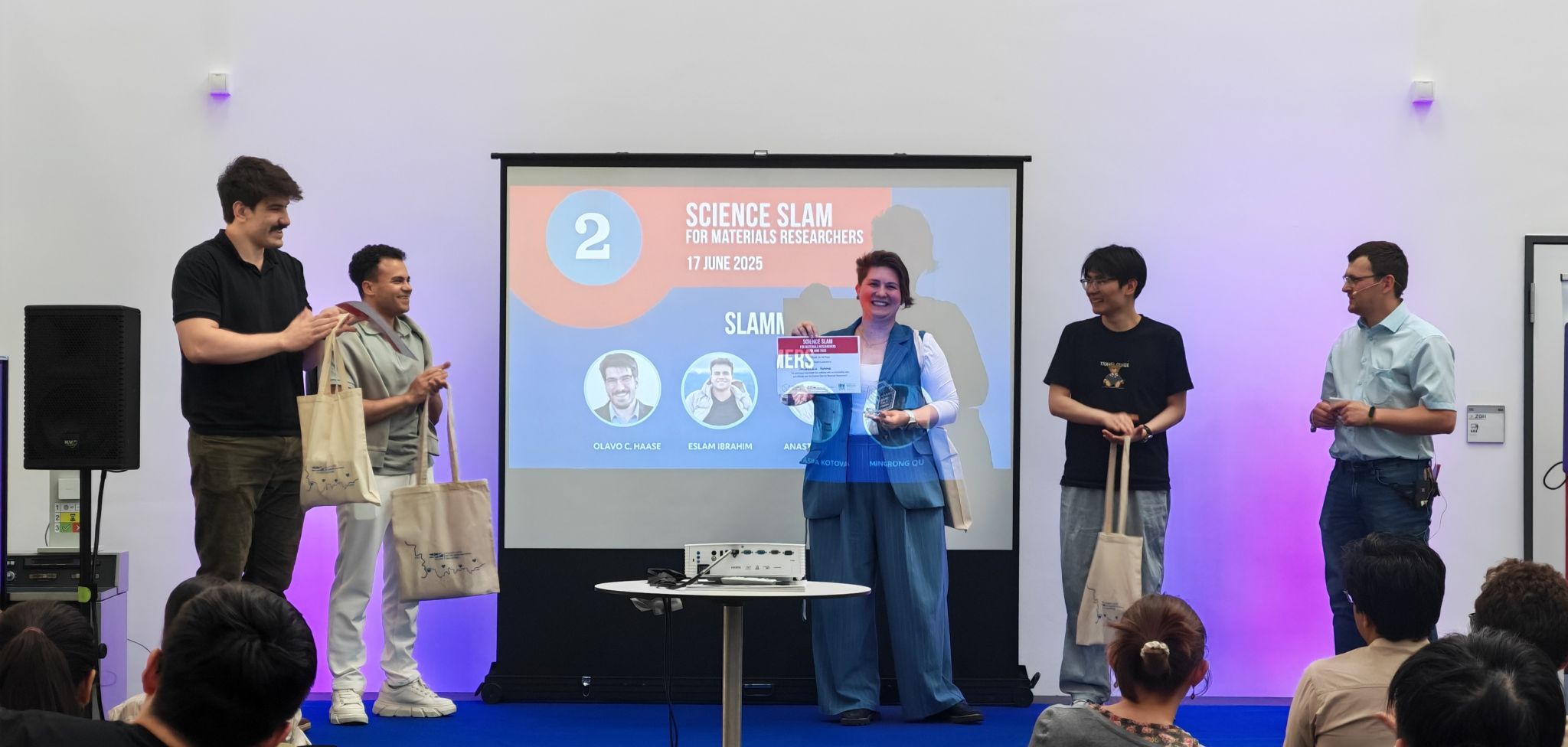 [17 June 2025] Our PhD candidate Anastasiia Kotova secured first place in the 2nd Science Slam for Materials Researchers with a presentation on the OER mechanism of Co₃O₄ nanoparticles as electrocatalysts for water splitting. The presentation highlighted nanoscale phenomena observed through electrochemical studies and TEM analysis.
